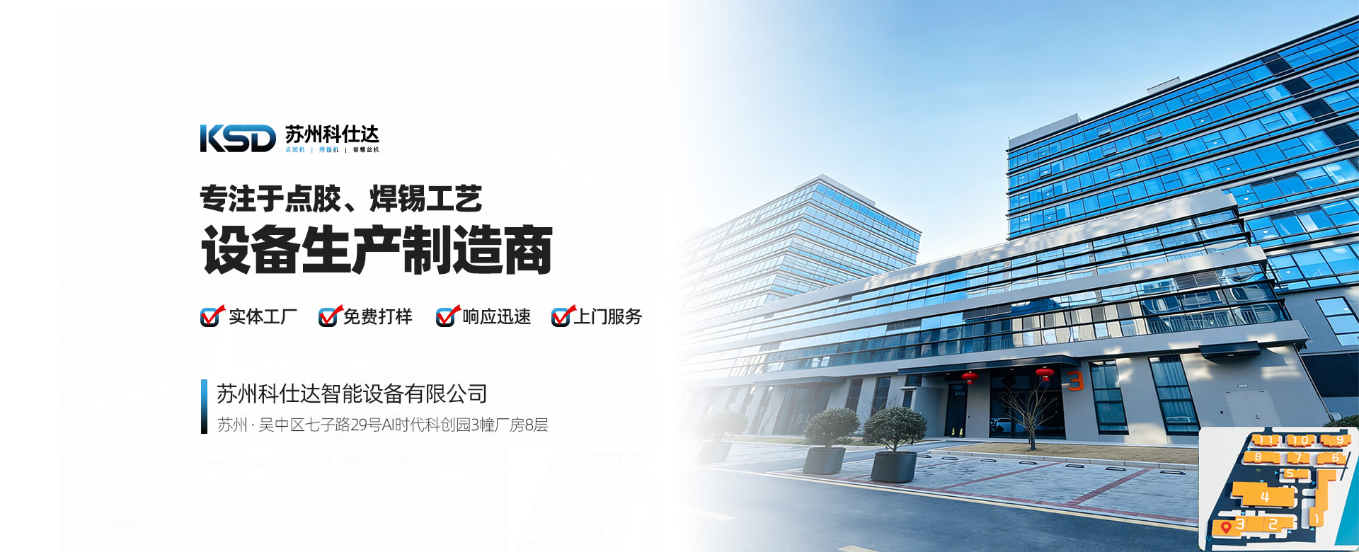 苏州科仕达智能设备有限公司位于中国·苏州吴中区AI时代科创园3幢,集涂胶和焊锡工艺的研发、生产、销售、服务于一体化的高精密科技型企业,采用智能智造技术+物联网+大数据进行数据化分析和管理,为国际国内企业提供定制设备、数据化管理系统解决方案,助力中国智造。
